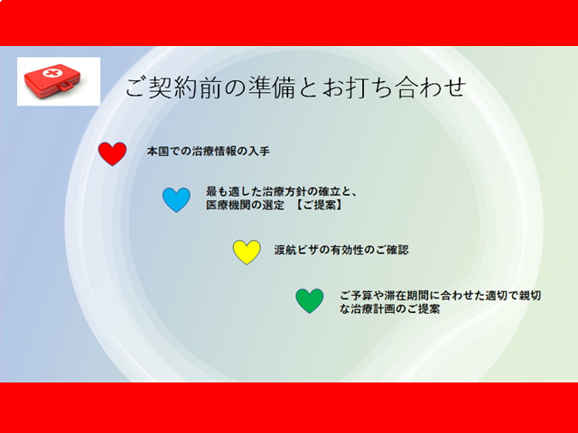 ★⽇本での各種検診や治療を希望する外国⼈の皆様へ、優良医療機関のご紹介、検査・治療スケジュールの⽴案や受診予約・ 受診当⽇の医療通訳など患者様からのお問い合わせから帰国後のアフターフォローまですべてを⼀貫してサポートいたします。